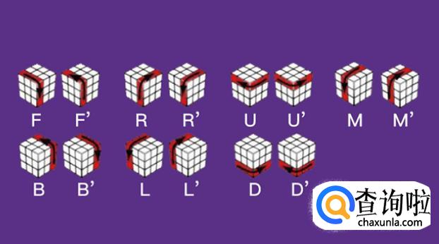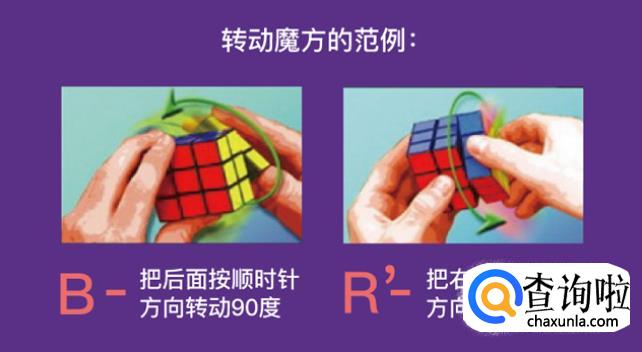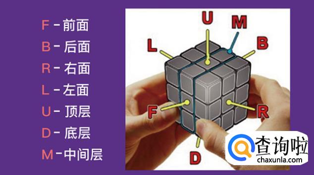 破解魔方时会用字母来说明要转动的1层或1面以及方向,例如:R(代表右面顺时针转90度),R`(代表右面逆时针转90度),R2(代表右面顺时针转2次90度)。