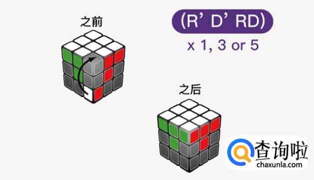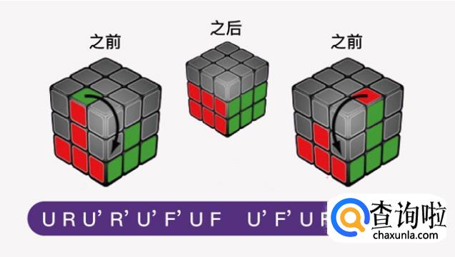 接着让中层边块归位,把白色面转向下,找出红绿边块,若红绿边块在顶层的话那就按顺时针方向转动顶层,直到边块与图上的1个情况相同,在按照口诀转动魔方,使得边块归位。若红绿边块在中间某层,但位置错误或颜色错误,可以先让红绿边块在右前方的位置,再重新按照下面其中的一个次序旋转1次。