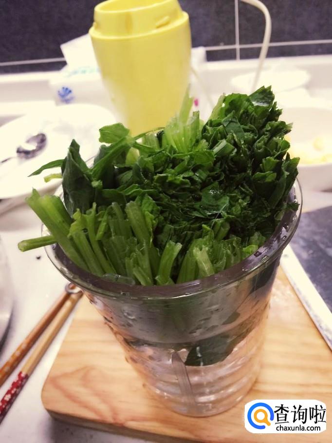 然后把菠菜切成小段,然后放入搅拌机中,加入少许的水打开开关进行搅拌