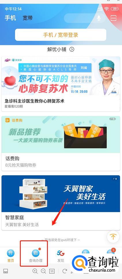 打开“电信营业厅”,在页面最下方找到【查询办理】菜单。