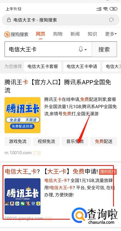 如果想要不被限流的问题困扰,可以使用“电信大王卡”,搜狗搜索“电信大王卡”,进入申请电信网卡页面。