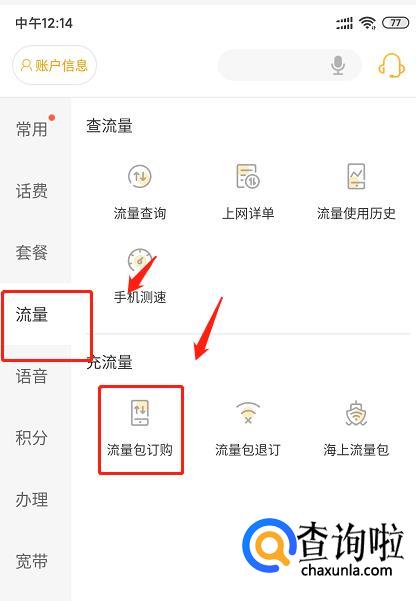 进入办理菜单后,选择【流量】窗口的【流量包订购】。