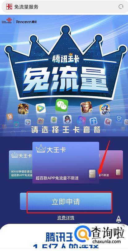 进入大王卡申请页面后,点击【立即申请】,之后选择想要的套餐类型,点击【确认】。