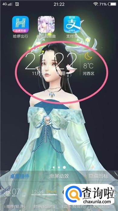 点击自己喜欢的图标样式后,时间和天气就跑到屏幕上方去了,然后按一下手机右下角,屏幕就回到桌面状态了。