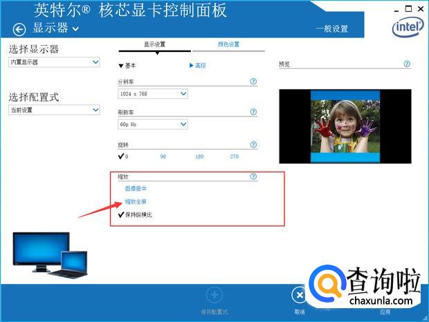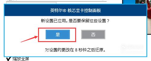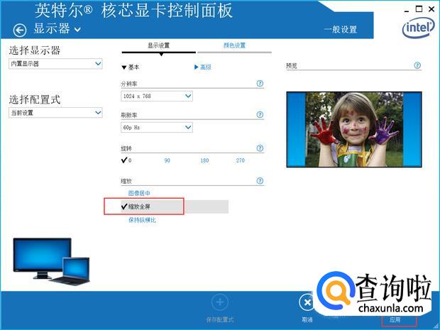 选择(缩放全屏)后,在右下角单击(应用),将更改的设置进行应用。