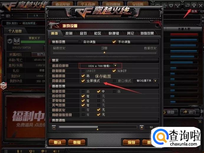 设置cf穿越火线分辨率,进入游戏,点击右上角设置按钮,选择分辨率,选择1024*768,全屏模式勾上,如下图。