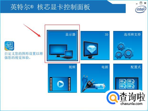 在英特尔核芯显卡控制面板,选择“显示器”。