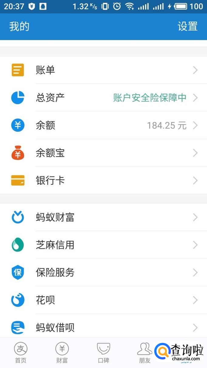 进入支付宝我的界面,在选项中点击“设置”