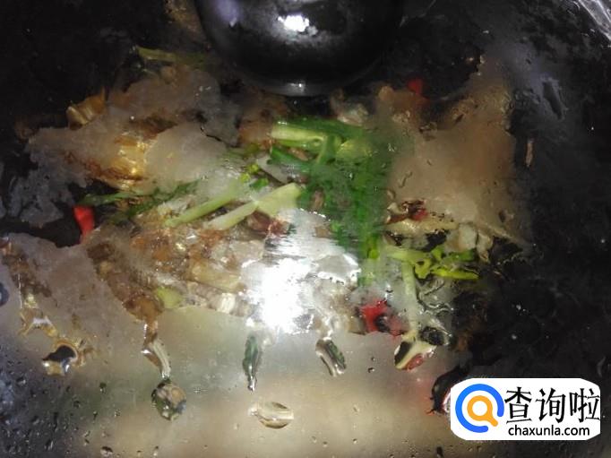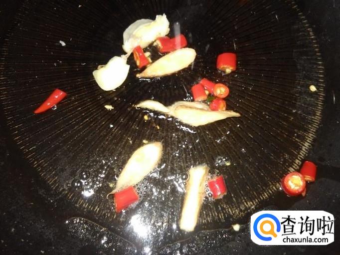 再开火下油,放蒜米、小米辣、姜片进去爆香,然后煎鱼回锅。