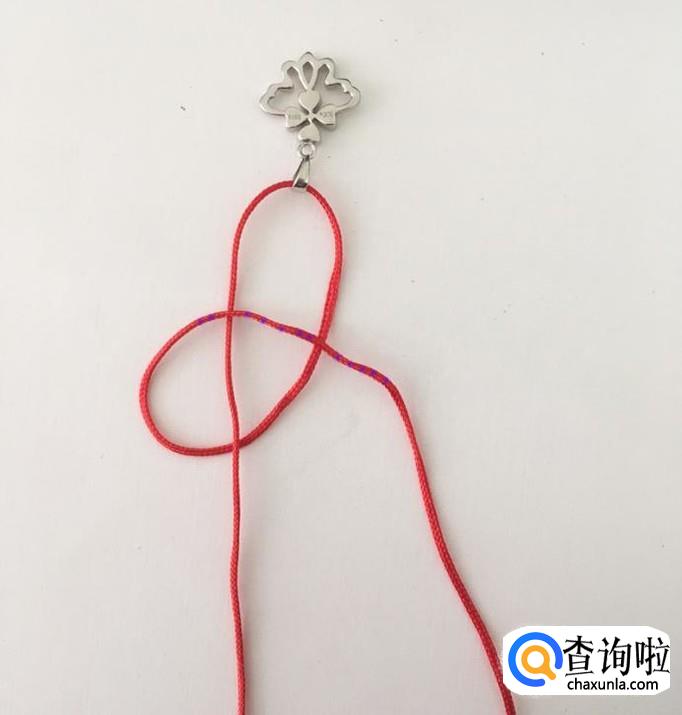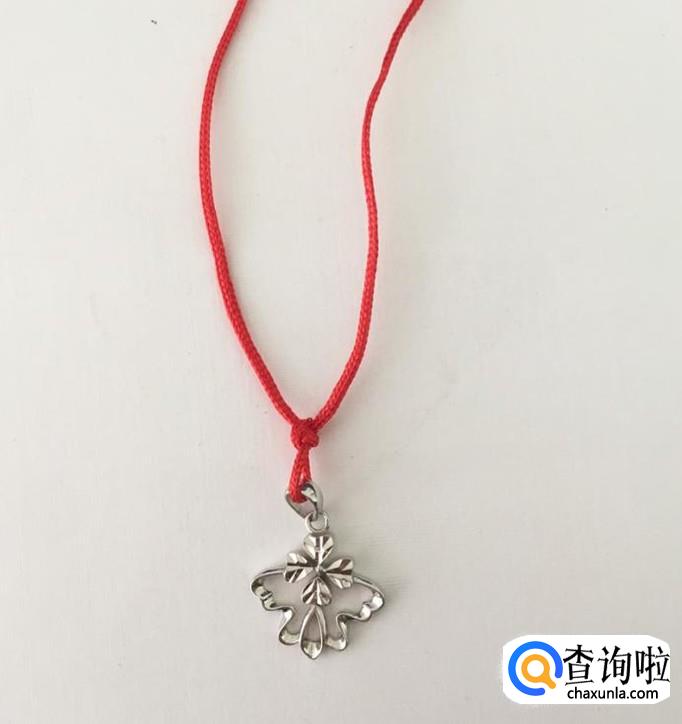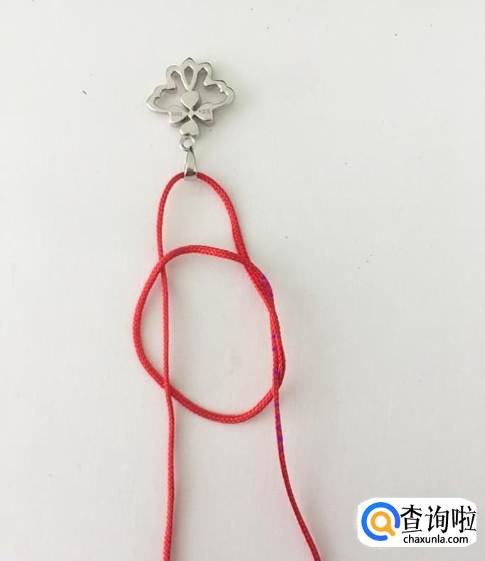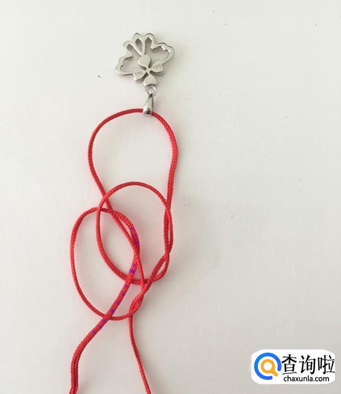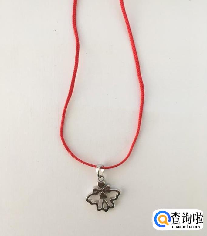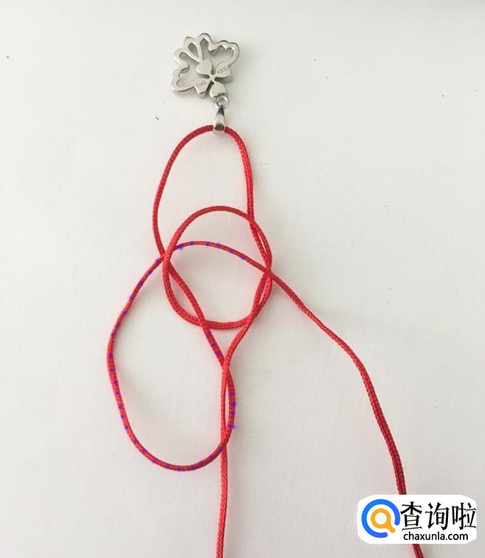 取一根长度适宜的绳子,这里以红绳子为例,先将绳子穿过吊坠。