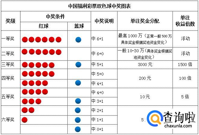六等奖:猜中2个红球+1个蓝球或者猜中1个红球+1个蓝球或者猜中1个蓝球。