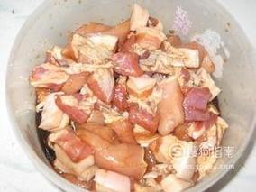 然后准备五花肉,把肉切成小块开始腌制,加上耗油,酱油,盐,黑芝麻,香油,各放一勺,把它搅均匀等待十五分钟才可以包棕子!