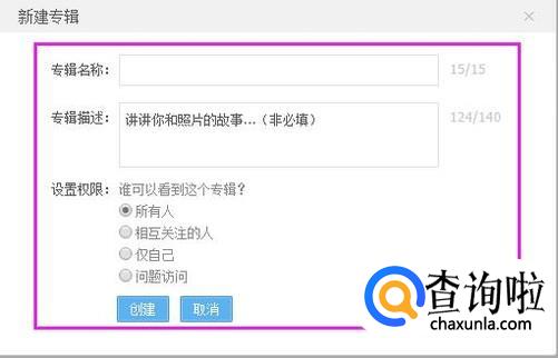 输入专辑名字、描述,设置查看权限等,如图。