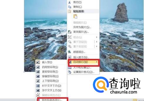 选中插入的图片,然后点击鼠标右键,选择【自动换行】【其他布局选项】
