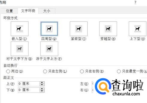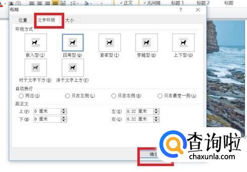 进入布局后,点击【文字环绕】,然后选择你想要的文字环绕方式,点击确定就好啦。