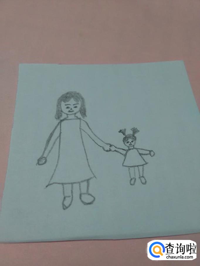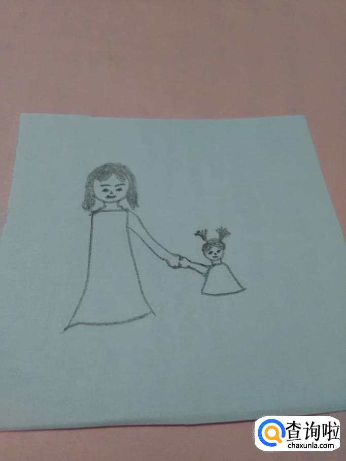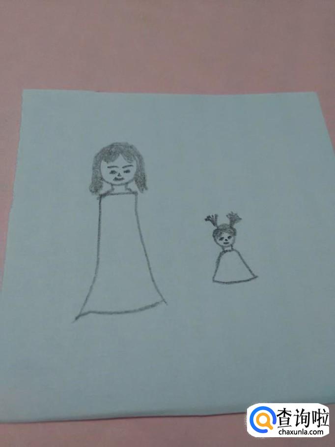 在妈妈的头下,先画两条竖线,表示脖子,在脖子下面,画一个长长的梯形,表示连衣裙,在孩子头下,先画两条竖线,表示脖子,在脖子下面,画一个小梯形,表示连衣裙。