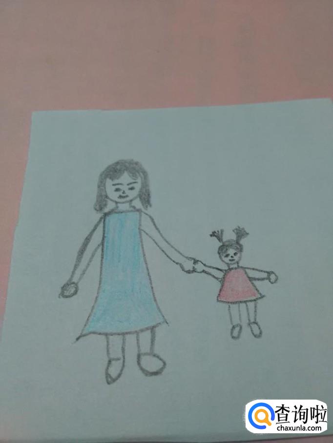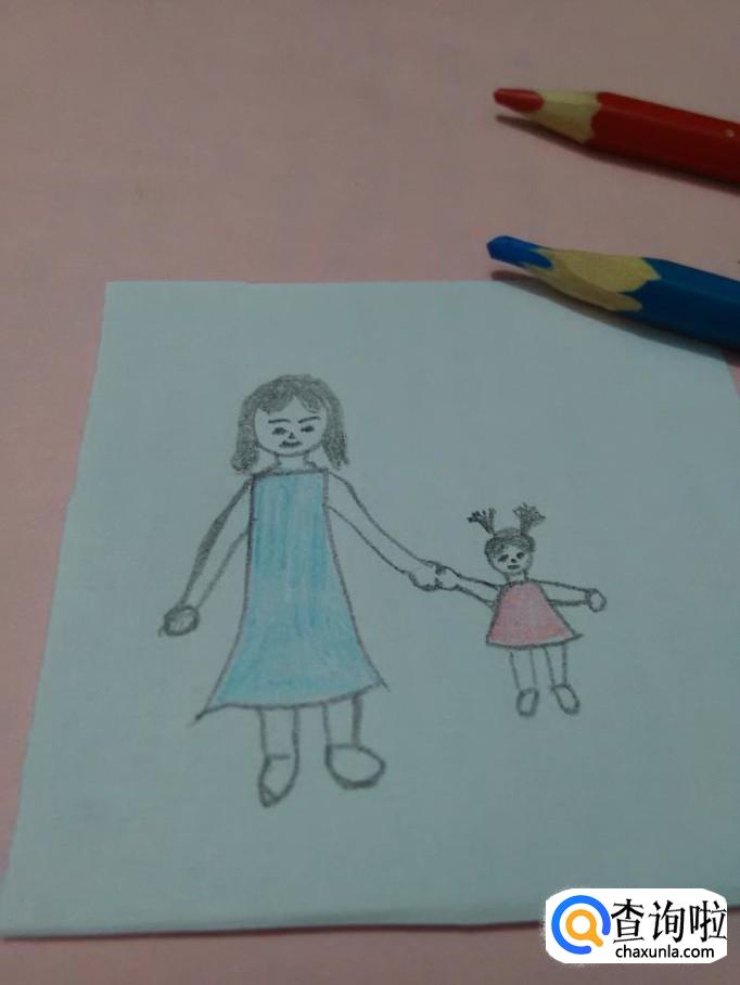 最后,用蓝色涂妈妈的裙子,用红色涂孩子的裙子,亲子手拉手就画完了。