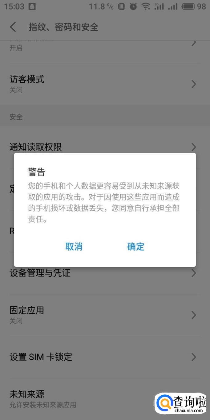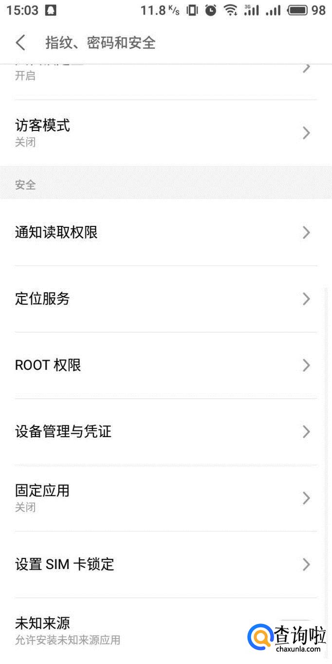 进入指纹、密码和安全设置界面,在下方能够看到“未知来源”,关闭状态下部分应用就没有办法安装。