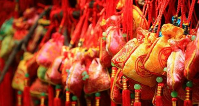 端午节小孩佩香囊,不但有避邪驱瘟之意,而且有襟头点缀之风。香囊内有朱砂、雄黄、香药,外包以丝布,清香四溢,再以五色丝线弦扣成索,做各种不同形状,结成一串,形形色色, 玲珑夺目。
