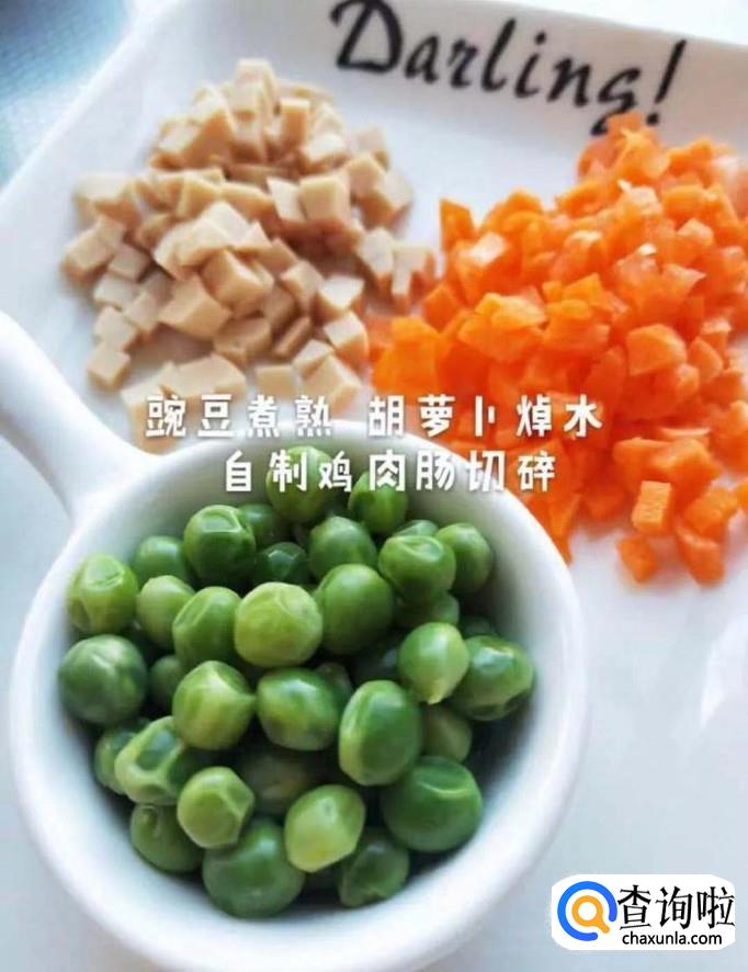食材:豌豆,胡萝卜,鸡肉肠,鹌鹑蛋,食用油,食用盐。
