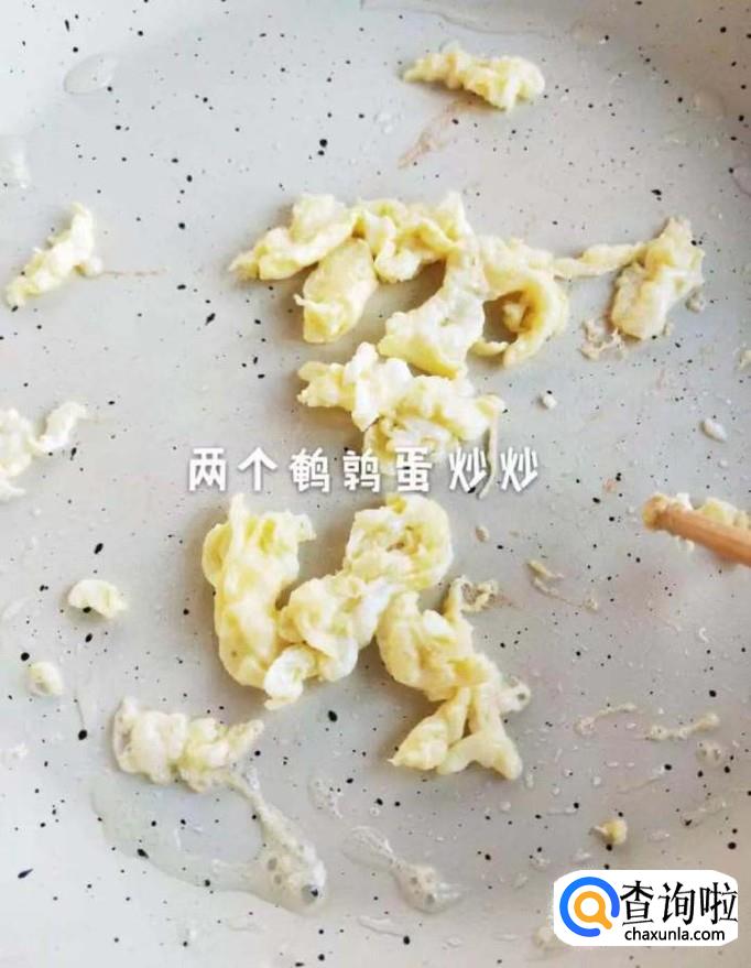 接着锅中放入适量的食用油,待油冒烟,打入两个鹌鹑蛋翻炒两分钟,如下图所示。