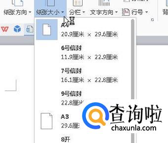 点击“纸张大小”的下拉按钮,弹出一列表,这里展示着各种大小的规格。我们从中选择一种。
