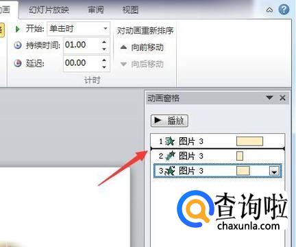 点击动画窗格,右侧窗格中就显示了三个动画的播放顺序。