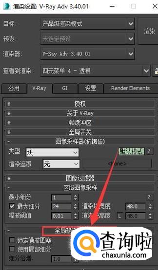 在V-Ray选项下找到并点击打开【全局确定性蒙特卡洛】