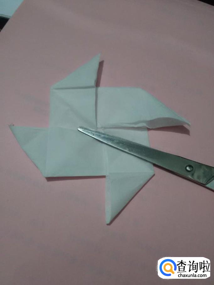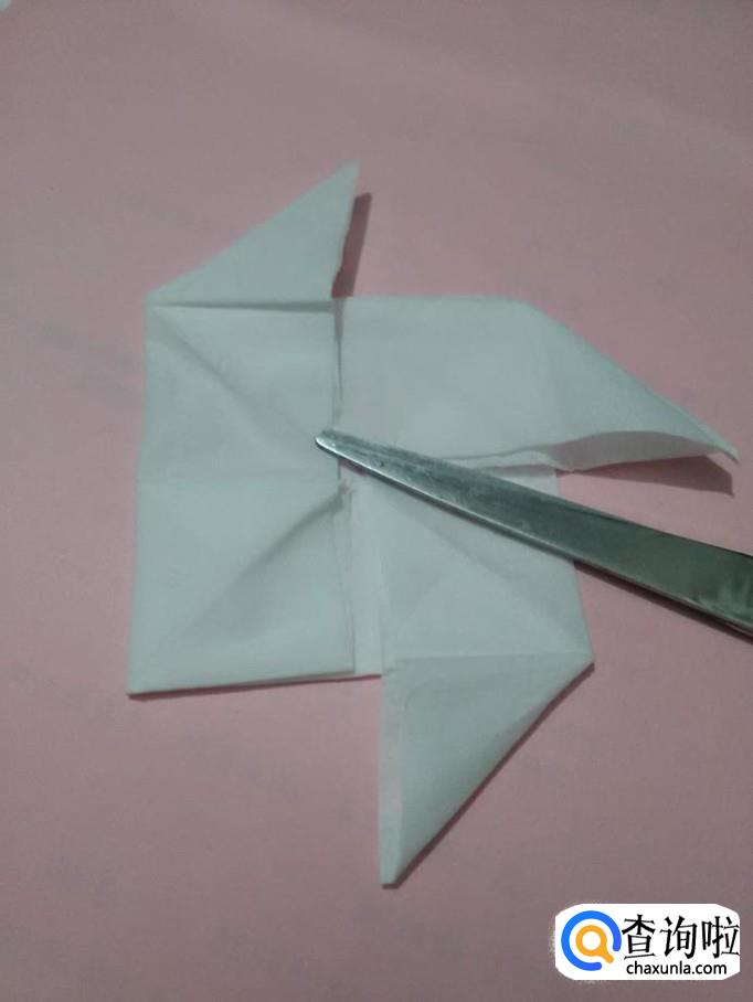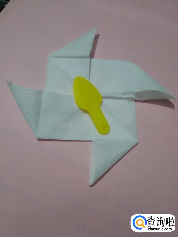 再将正方形的左下角向左边拉出来,风车样式就折好了。