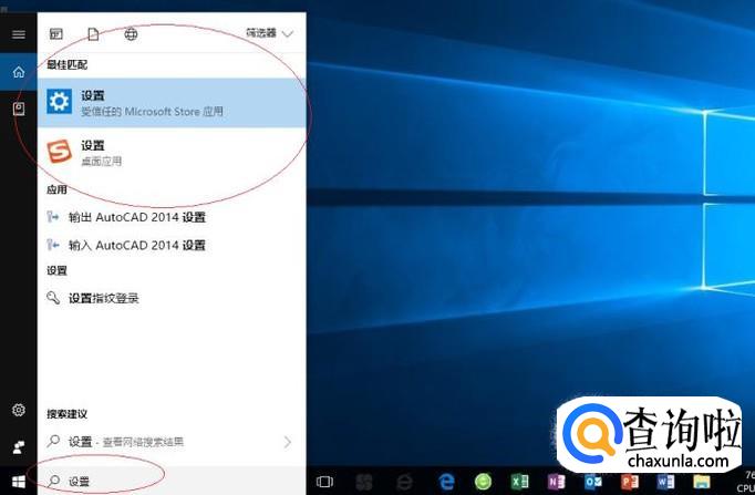 如图所示,搜索框输入"设置"。Cortana(小娜)显示搜索结果,点击"最佳匹配→设置"项。