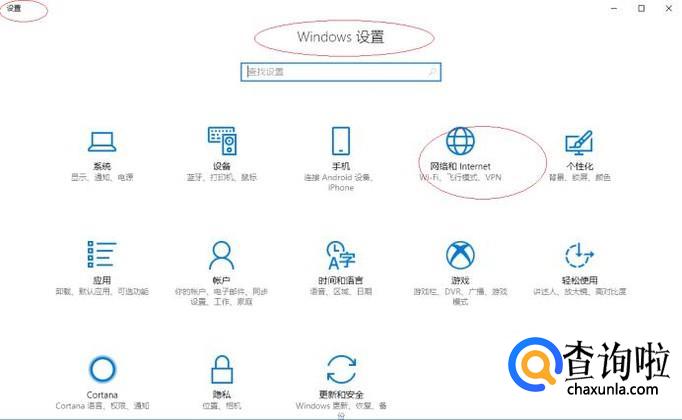 唤出"Windows 设置"程序窗口,如图所示。点击"网络和Internet"图标,用户可以根据自己的喜好和需要对系统进行设置。