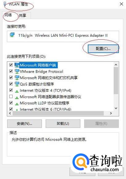 弹出"WLAN 属性"对话框,如图所示。选择"网络"标签,点击"配置..."按钮。