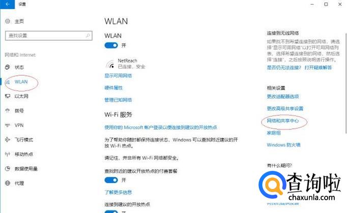 如图所示,唤出"网络和Internet"设置界面。选择左侧"WLAN"项,点击右侧"相关设置→网络和共享中心"图标。