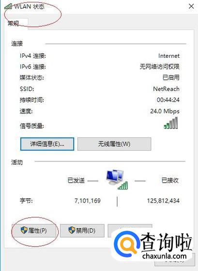 如图所示,弹出"WLAN 状态"对话框。选择"活动"选项区域,点击"属性"按钮。
