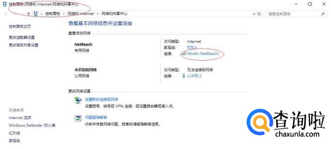 唤出"网络和共享中心"设置界面,如图所示。点击右侧"WLAN连接"图标,下步将进行排除笔记本电脑连接无线很慢的故障。