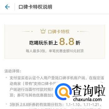 口碑卡相当于是折扣卡,是有优惠的,能够折上8.8折,在口碑商家均可使用,全国通用。