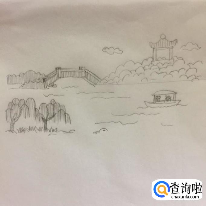 然后在拱桥的对面画出几棵柳树以及树下的小草,如下图所示。