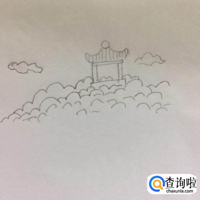 然后在凉亭的下方画出一些波浪线作为森林,在凉亭的上方画两朵正在移动的云朵,如下图所示。