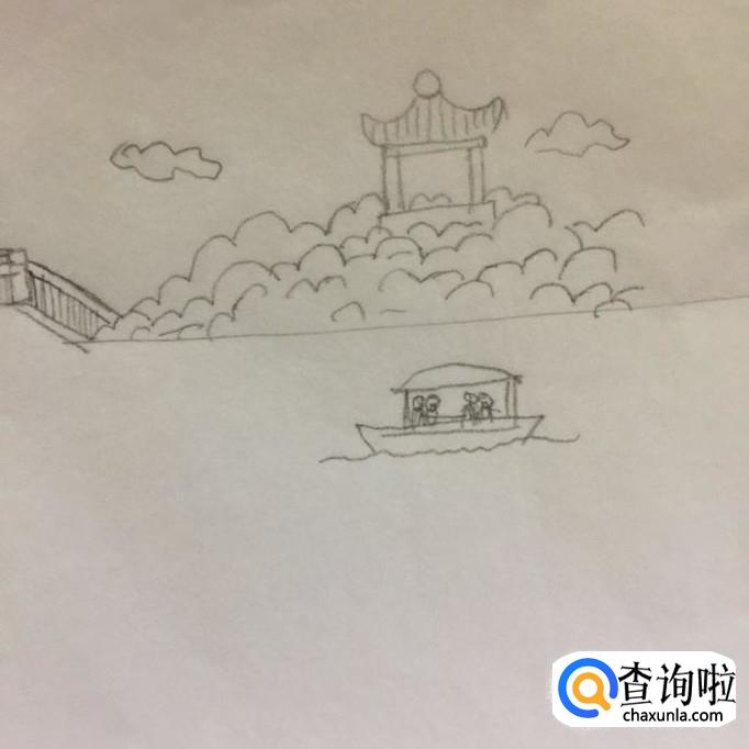 接着在湖面上画出一艘小船以及船上的小人,如下图所示。
