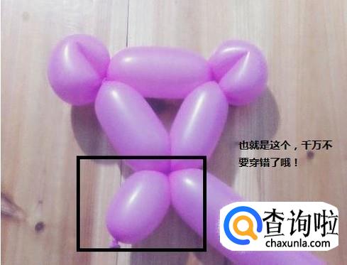 把最小的那个,也就是我们做好了两个耳朵以后剩下的那一个,穿过我们的大圆圈,这里可能气球会有点紧绷,不过不会炸的,所以大家可以放心。