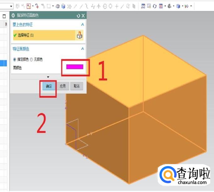 颜色指定完毕,就会回到“指派特征面颜色”对话框,这时候你就可以看到它的变化了,首先1号红色框选中的面颜色变成了我们指定的粉红色了,其次。。。。。。没有其次了,可以直接点击2号红色框选中的“确定”按钮,结束操作。