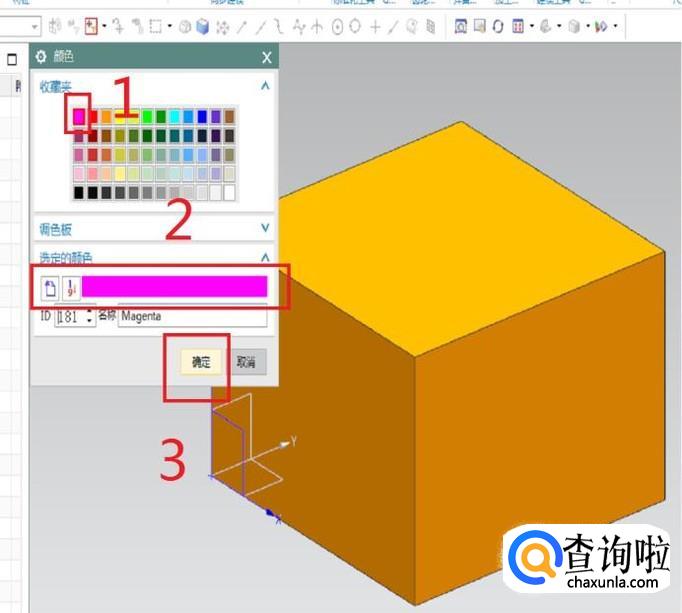 如下图所示,笔者选择了收藏夹中的第一个颜色:“粉红色”,见1号红色框选,然后就可以看到2号红色框选中的颜色就变成了粉红色,接着点击3号红色框选中的“确定”按钮,这里的操作就结束了。