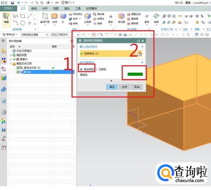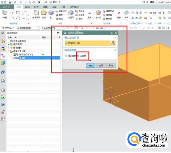 这个对话框会给我们提示我们需要做什么。首先第一项,要上色的特征(选择特征),软件已经默认了刚刚的长方体,所以这一步可以省略;然后第二项,特征面颜色,注意红色框选,可以看到软件默认的是“无颜色”。