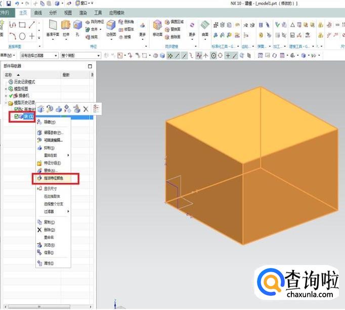 第二幅图:在部件导航器中找到长方体,不过在这里它不叫长方体,它有另外一个名字“块”,如下第二幅图中的第一个红色框选,鼠标左键单击它,然后再单击鼠标右键,会出现下拉菜单,同样的,在下拉菜单中找到“指派特征颜色”,见下第二幅图第二个红色框选。