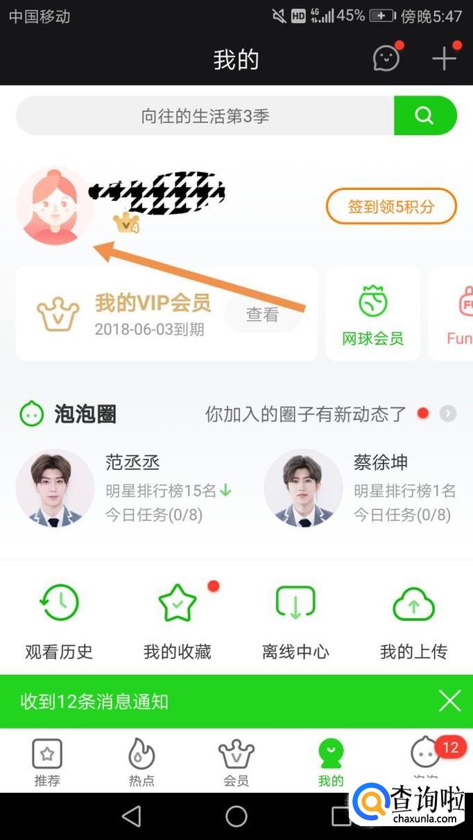 首先打开爱奇艺APP,点击我的,然后点击自己的会员头像,如下图。