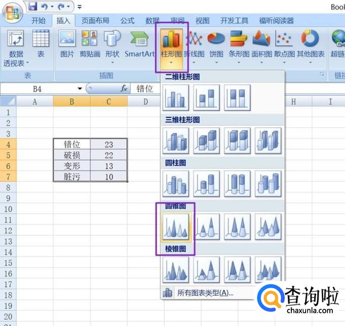 然后我们点击柱形图的下拉箭头,选择簇状圆锥图;
