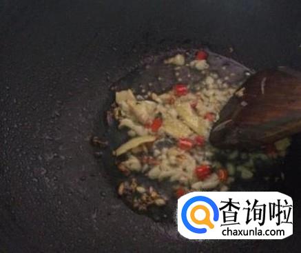 热锅下油,放蒜米、姜丝、小米辣进去爆出味来。