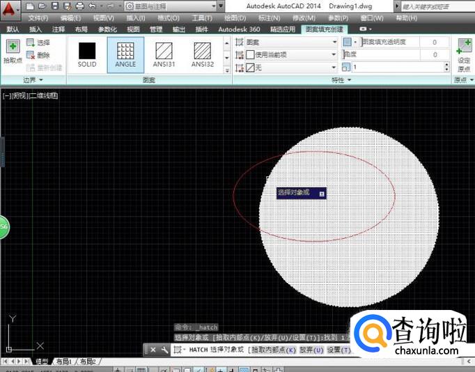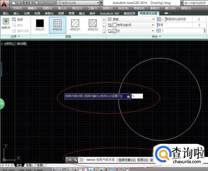点击"默认→绘图→图案填充"图标,命令栏显示"拾取内部点或[选择对象(S)/放弃(U)/设置(T)]"。