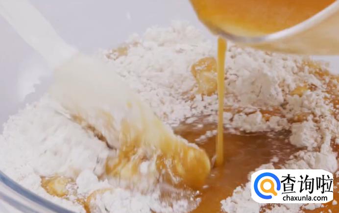 将备好的柿子肉放进来,制作成湿料。