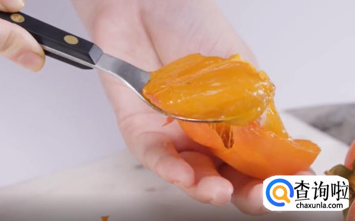 将准备好的奶油柿对半切开,再用勺子将柿子肉舀出来,装在碗里。